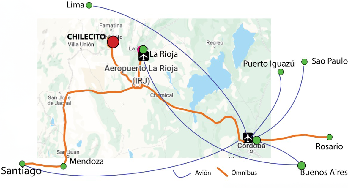 Chilecito no tiene aeropuerto, el más cercano es el de La Rioja, a aproximadamente 3 horas por ómnibus de línea.